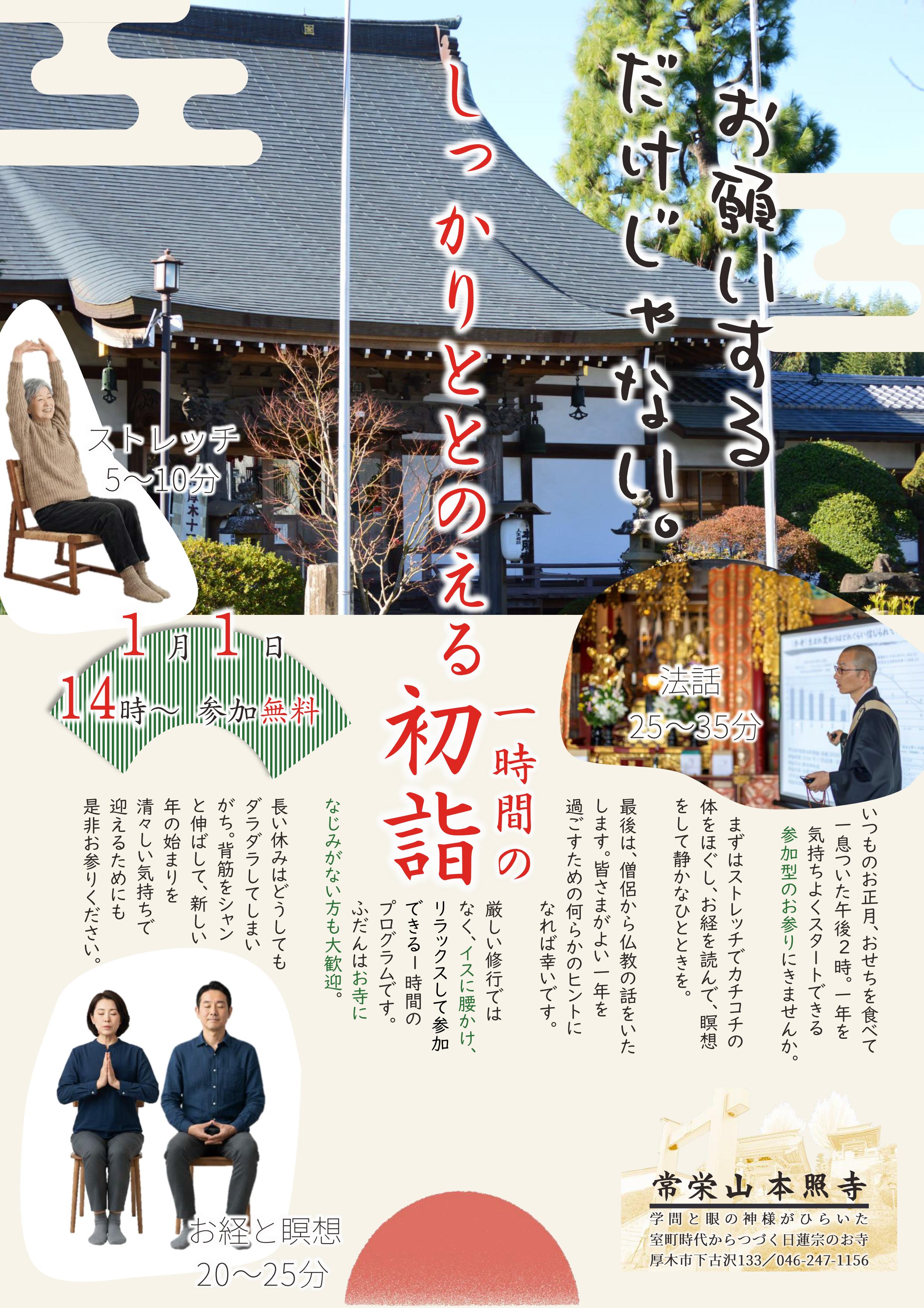 「新年に初めて寺社をお参りしてお願いごとをする」という今までの初詣を、「元日に一時間お寺でしっかりととのえる」お参りに改めてみませんか。