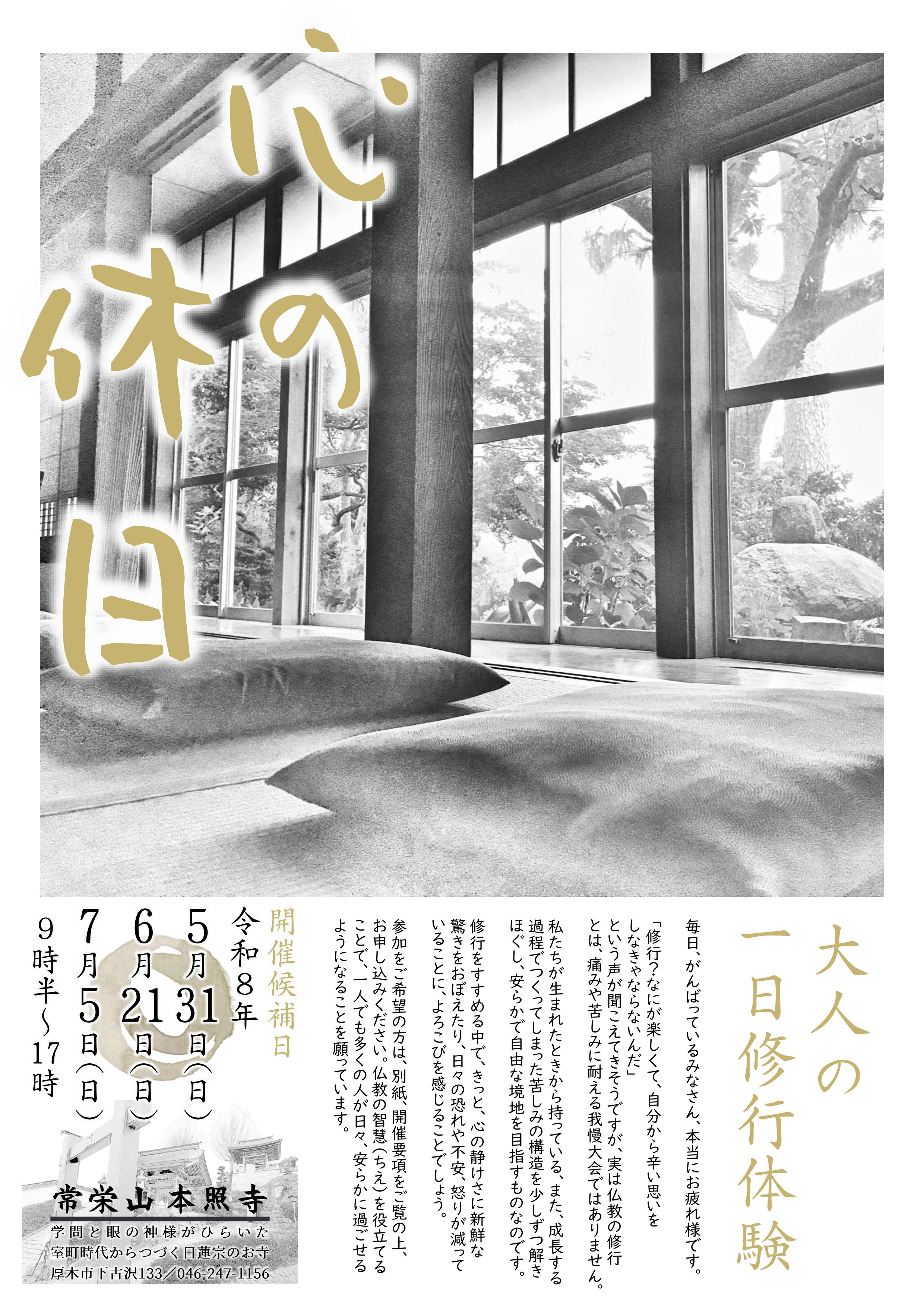 チラシでは「心の休日」という表現を用いていますが、これは修行を通して自然に導かれる心の状態を表したものであり、体験の方向性そのものではない点を、あらかじめご理解ください。